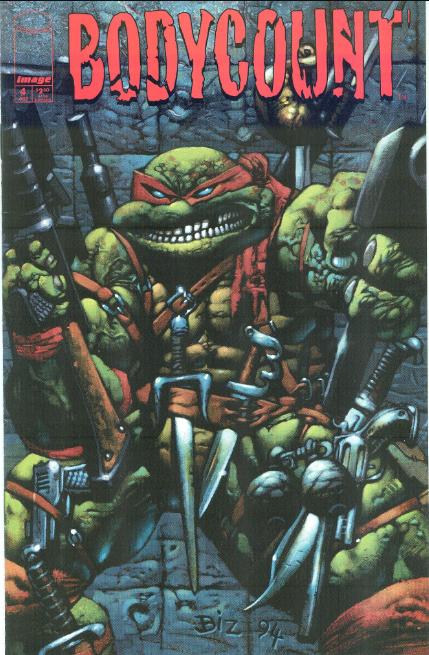 By this point in the series, you can tell that Bisley has thrown any attempt at seriousness out the window and the art becomes as surreal and wacky as an issue of MAD Magazine. Outside of the primary cast, the entire universe appears to be populated by grotesquely deformed caricatures of human beings. It certainly makes the panels interesting and adds a jovial tone I don’t think Eastman had in his script (something tells me Eastman thought he was playing this straight while Bisley knew to do otherwise). There are some cartoonish effects near the end, as cherubs nail Casey and Midnight as they smooch, too. The lunacy of this entire series would make me want to write it off as an alternate universe “comedy” piece, ala the issues of TMNT (Vol. 1) by Mark Martin or Hedden & McWeeney, but the fact that this acts as the origin for Casey’s star-spangled hockey mask from the Image series means it actually has an impact on the overal narrative of the book. An incredibly, incredibly miniscule impact.